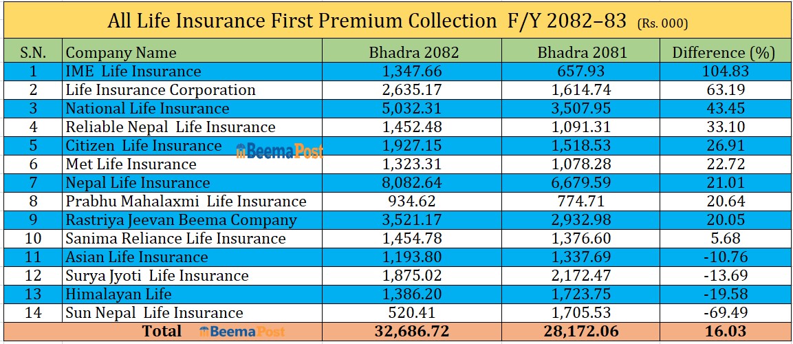 IME Life Insurance, LIC Nepal, and National Life Insurance were particularly aggressive in acquiring new business, demonstrating notable growth over the previous fiscal year. IME Life Insurance stood out with an impressive 104.83 percent increase in first premium income in Bhadra alone. LIC Nepal followed with a 63.19 percent growth, reflecting its active efforts to expand its portfolio. National Life Insurance also recorded a 43.45 percent rise in first premium income during the same period.