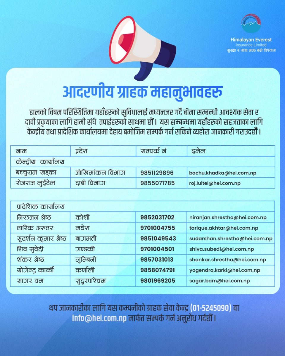 Himalayan Everest Insurance has also urged remaining claimants to submit the required documents and contact their nearest branch or the central office to expedite settlement.