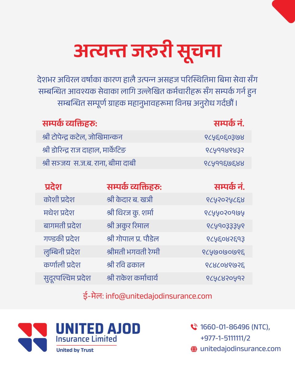 Furthermore, United Ajod Insurance has designated provincial contact persons to ensure timely assistance for affected policyholders. Kedar Bahadur Khatri will oversee Koshi Province, Dhiraj Kumar Sharma for Madhesh, Akur Rimal for Bagmati, Gopal Prasad Poudel for Gandaki, Bhagwati Regmi for Lumbini, Ravi Dhakal for Karnali, and Rakesh Karmacharya for Sudurpaschim Province. The company has made all these contacts public to facilitate immediate support and guidance for filing insurance claims.