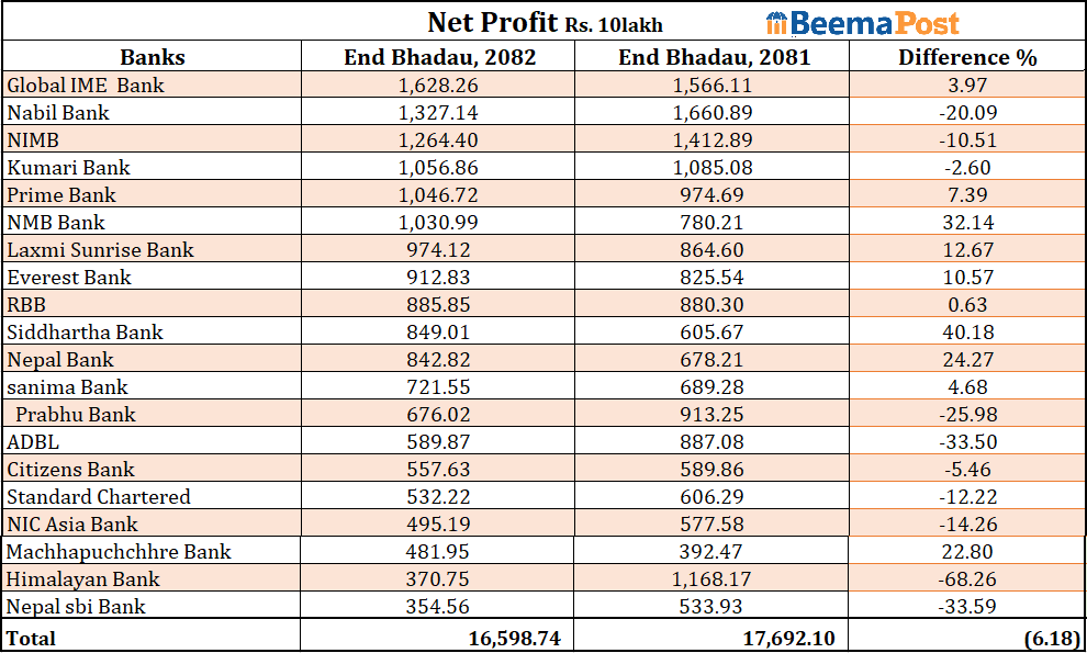 The decline in overall profit reflects a mixed performance among the banks—half of them witnessed a fall in earnings while the remaining half achieved growth during the review period covering the months of Shrawan and Bhadra.