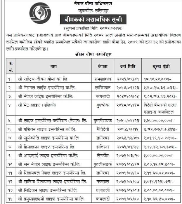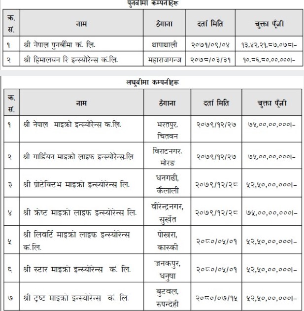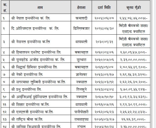 According to Purna Bahadur Thapa, Information Officer at the Authority, the renewed list includes 14 life insurance companies, 14 non-life insurance companies, 2 reinsurance companies, and 7 microinsurance companies.