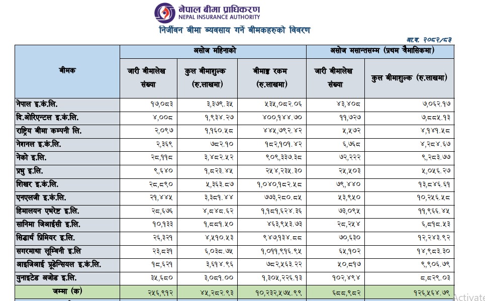 Among them, Sagarmatha Lumbini Insurance led the market, collecting the highest premium of Rs 1.49 billion. It was followed by Shikhar Insurance, which earned Rs 1.38 billion , and Siddhartha Premier Insurance, with a total premium of Rs 1.22 billion. Likewise, Himalayan Everest Insurance earned Rs 1.19 billion in the same period.