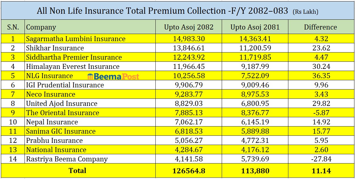 Among them, Sagarmatha Lumbini Insurance topped the list, collecting the highest premium of Rs 1.49 billion during the review period — a growth of 4.32 percent compared to last year.