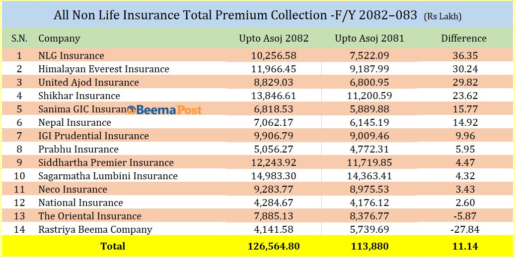 According to the financial statements published by the Nepal Insurance Authority on Tuesday, the 14 non-life insurance companies operating in the country earned a combined insurance premium of Rs 12.65 billion, compared to Rs 11.38 billion in the same period of the previous fiscal year.