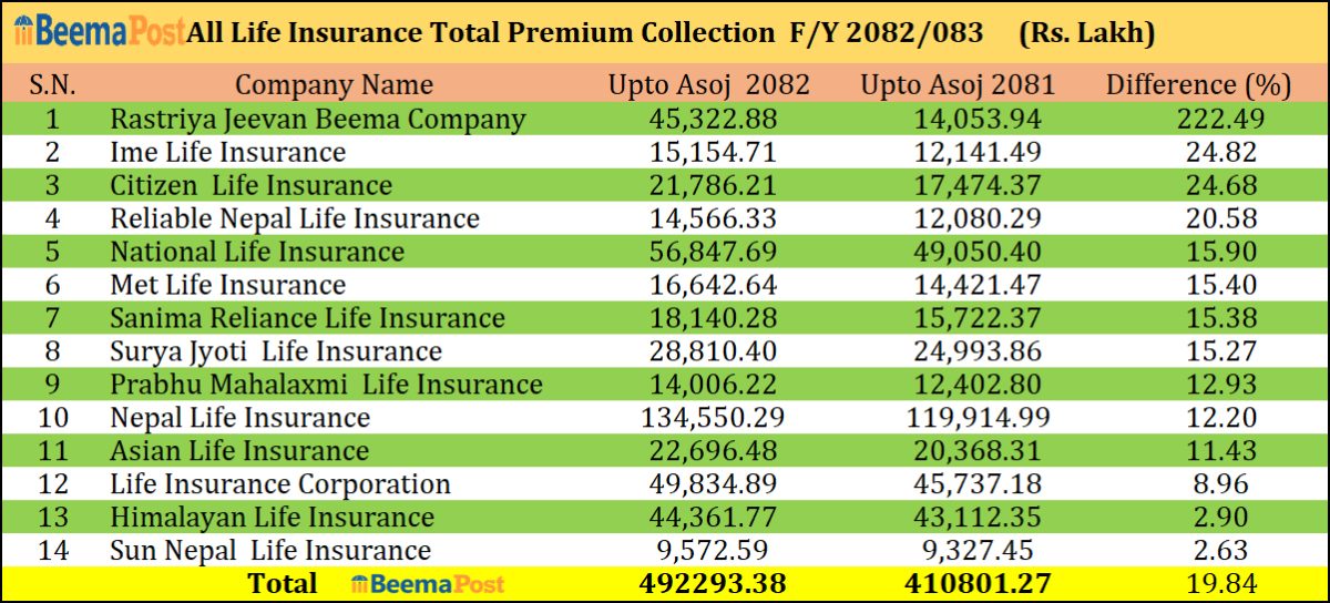 The government-owned Rastriya Jeevan Beema Company posted a remarkable growth of 222.49%, reaching Rs 4.53 billion, while Himalayan Life Insurance earned Rs 4.43 billion, marking a 2.90% increase. Similarly, Suryajyoti Life Insurance reported premiums of Rs 2.88 billion.