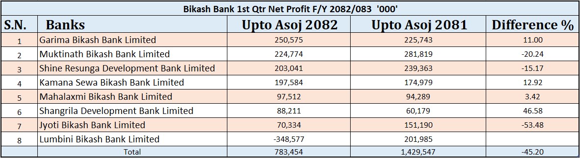 Among those showing improvement, Kamana Sewa Bikas Bank saw a 12.92 percent increase in profit, reaching Rs 197.5 million, while Mahalaxmi Bikas Bank recorded a modest 3.42 percent rise to Rs 97.5 million.