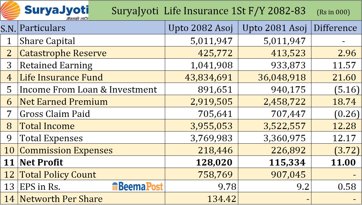 Kathmandu – Suryajyoti Life Insurance Company Limited has reported a net profit of Rs 128 million in the first quarter of the current fiscal year, according to its recently published financial statement. This marks an 11 percent increase compared to the same period last year, when the company earned a profit of Rs 115.3 million.
