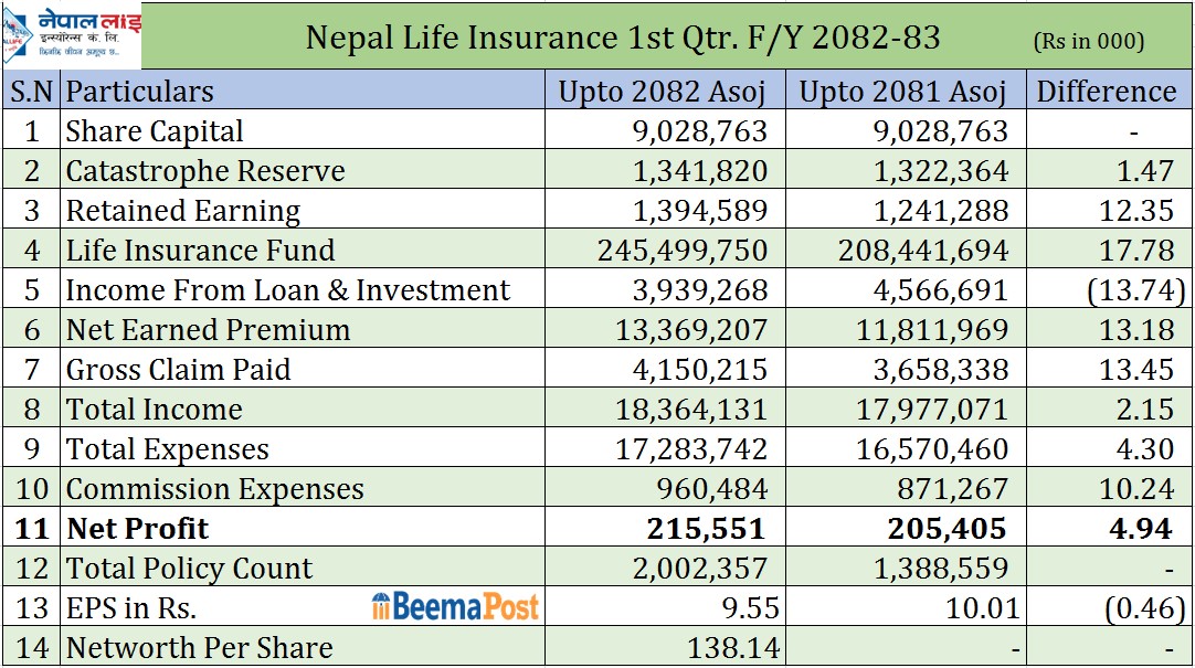 Kathmandu — Nepal Life Insurance Company Limited has reported a net profit of Rs 215.5 million in the first quarter of the current fiscal year, marking a 4.94 percent increase from the Rs 205.4 million earned during the same period last fiscal year.