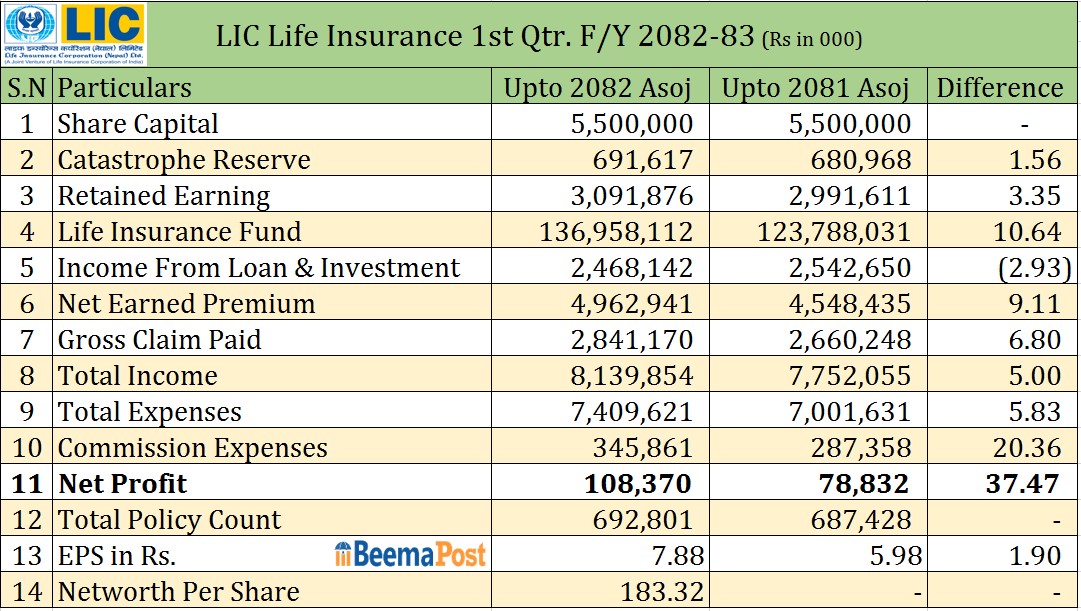 Kathmandu — Life Insurance Corporation (Nepal) Limited (LIC Nepal) has posted a net profit of Rs 108.3 million in the first quarter of the current fiscal year, reflecting a robust 37.47 percent growth compared to the Rs 78.8 million earned during the same period last year.
