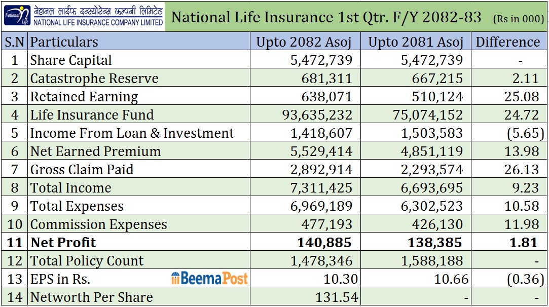 Kathmandu — National Life Insurance Company Limited has reported a net profit of Rs 140.8 million in the first quarter of the current fiscal year, marking a modest 1.81 percent increase compared to the Rs 138.3 million earned during the same period last fiscal year.