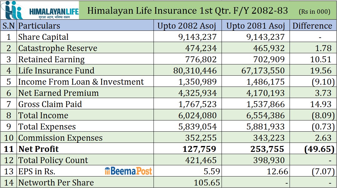 Kathmandu — Himalayan Life Insurance Company Limited has published its first-quarter financial results, reporting a significant decline in profitability despite modest growth in net insurance premium income.