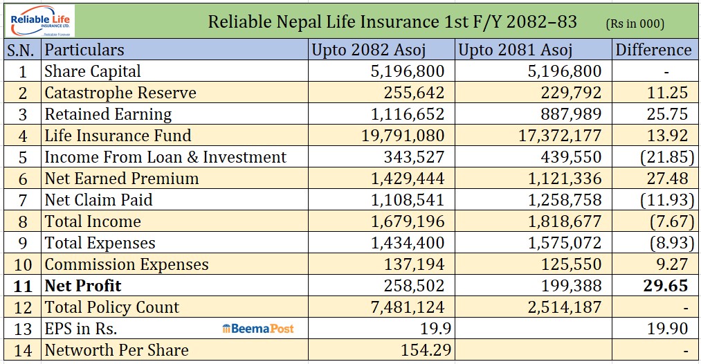 Reliable Nepal Life Insurance’s life insurance fund also posted healthy growth, increasing by 13.92 percent to Rs 19.79 billion.