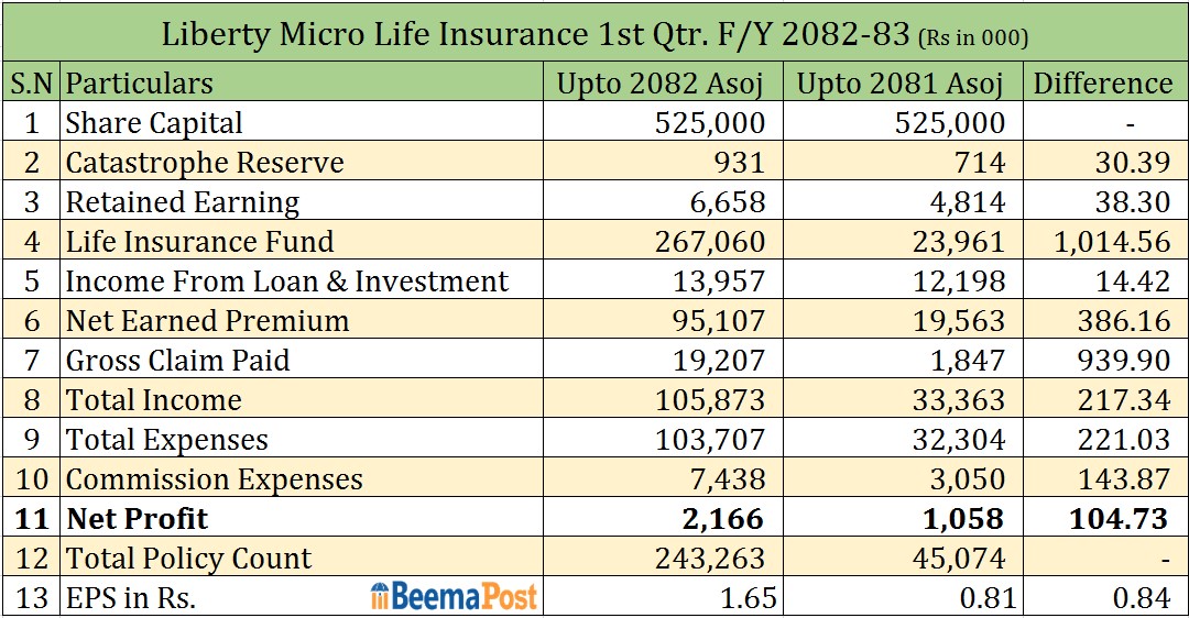 Kathmandu – Liberty Micro Life Insurance has reported a strong financial performance in the first quarter of the current fiscal year, earning a net profit of Rs 21.66 million. This marks a 104.73 percent increase compared to the Rs 1.058 million recorded in the same period of the previous fiscal year.