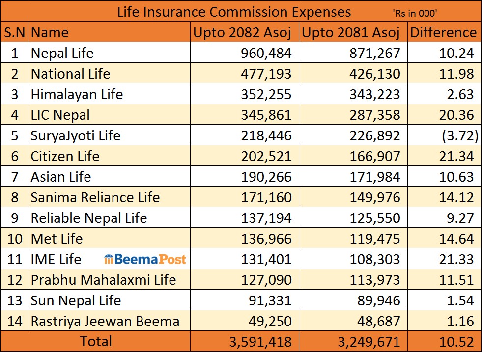 The data also reveals notable growth rates in commission payouts. Citizen Life recorded the highest growth with a 21.34 percent increase in commissions compared to the same period last year. IME Life followed closely with 21.33 percent, while LIC Nepal posted a 20.36 percent rise. Met Life and Sanima Reliance Life reported growth rates of 14.64 percent and 14.12 percent, respectively.