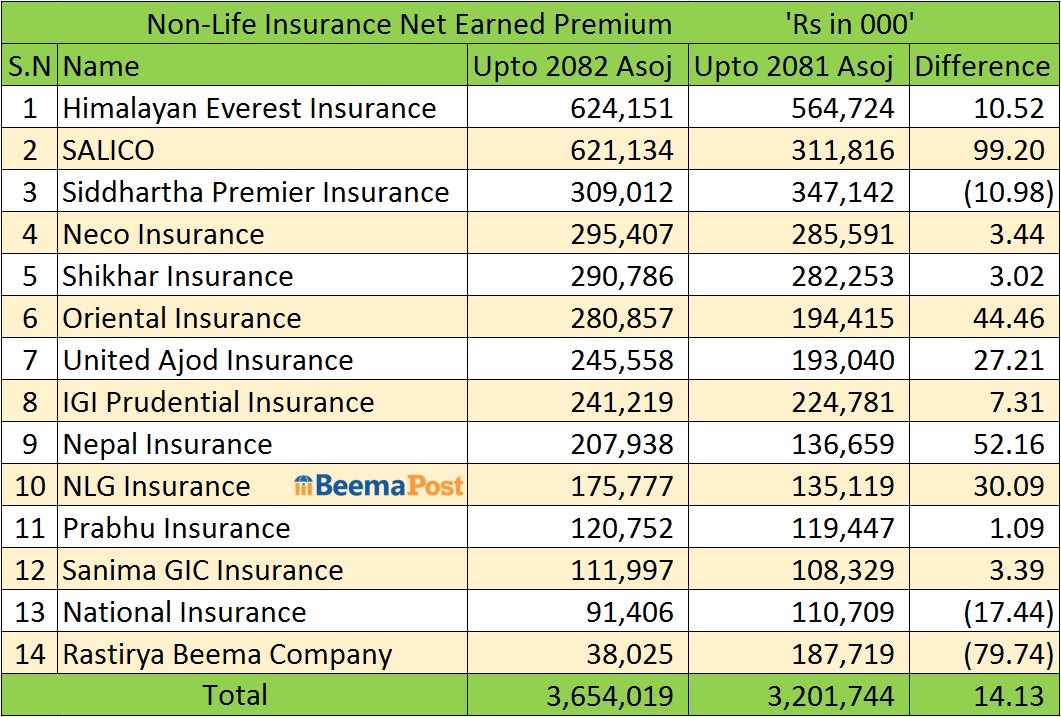 However, not all insurers recorded growth. Siddhartha Premier Insurance saw a 10.98 percent decline, National Insurance decreased by 17.44 percent, and the government-owned Rastriya Beema Company reported a steep 79.74 percent decline in net premium earnings.