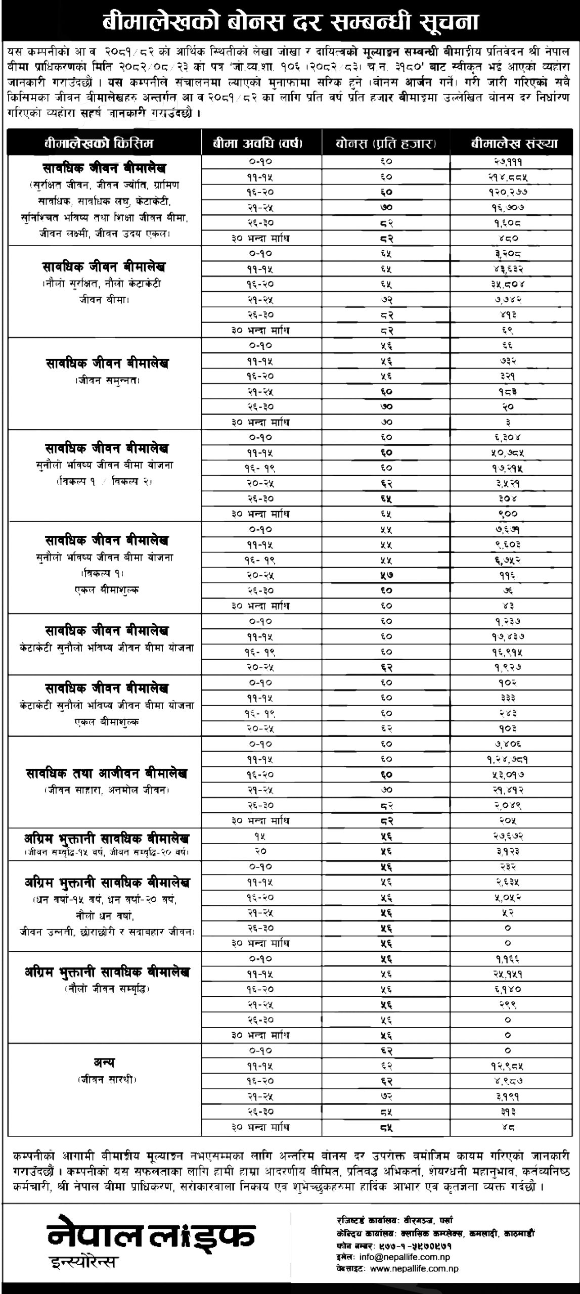 Nepal Life stated that these revised bonus rates will be applicable to all eligible policies and associated claims as per the actuarial valuation, providing clarity and consistency for policyholders across its insurance portfolio.
