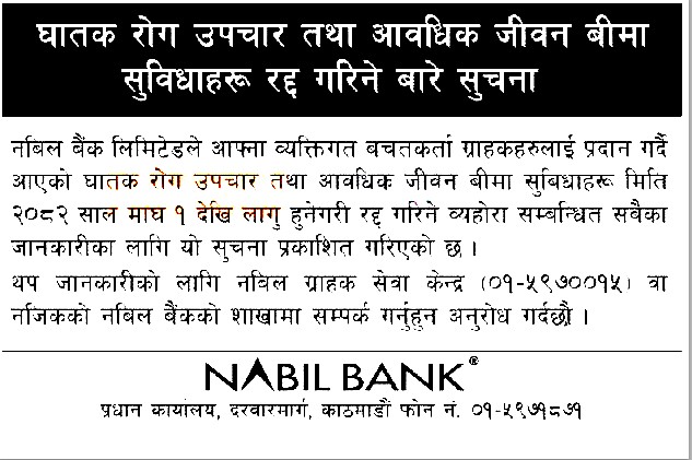 Kathmandu – Nabil Bank has announced that it will no longer provide critical illness treatment and term life insurance facilities to its customers.