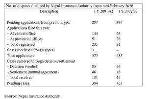 According to Bima Pratibimb published by the Nepal Insurance Authority, “A total of 91 cases were registered at the office of the Nepal Insurance Authority till the end of Magh this year. During this period, 65 cases were registered at the central office, while 26 cases were registered at the provincial offices.” In addition to this, 394 cases were carried over from the previous year, taking the total to 485 cases.