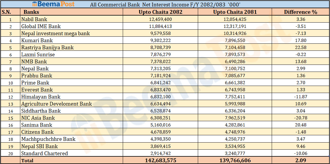Among other banks, Sanima Bank earned Rs 5.16 billion, Citizens Bank Rs 4.67 billion, Machhapuchchhre Bank Rs 4.39 billion, Nepal SBI Bank Rs 3.86 billion, and Standard Chartered Bank Rs 2.91 billion in net interest income.